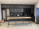 Objekteinrichtung Showküche Vollkernarbeitsplatte, eingefrästes Waschbecken rückseitig verklebt, Müllkipper aus Aluminium, Arbeitsplatte aus Edelstahl mit Kabelausschnitten